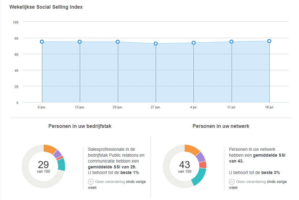 Onder je huidige SSI-score zie je de ontwikkeling per week en de gemiddelde scores van mensen uit jouw bedrijfstak en uit je netwerk.